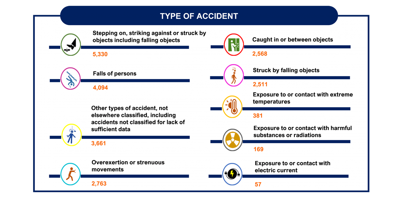 According to Exhibit 3 of Number of Occupational Injuries by type of Accident & Causes of Accident 2021, 60.8 per cent of Occupational injuries are caused by three (3) types of accident, namely Steeping on, Striking Against or Struck by Object ,including Falling Object ( 5,330 injuries, 109 death) , Fall of Persons (4,094 injuries, 95 death ) and other types of Unclassified Accident ( 3661 injuries, 0 death ) No matter where each Safety and Health Professionals working either in manufacturing sector or Construction sector, chance are good that he or she will spot one or more of 5 common safety hazard. Here, Sikar Professional consultants identify for safety and health the workplace trouble spots they see over and over again.
